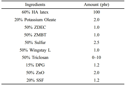 Materials. High Ammonia (HA) centrifuged latex was supplied by Yala Latex Industry Co., Ltd., based in Yala, Thailand. Triclosan was obtained from Chemipan Corporation Co., Ltd., Bangkok, Thailand. Additional ingredients including 50% Wingstay L, 50% zinc 2-mercaptobenzothiazole (ZMBT), 50% zinc diethyl dithiocarbamate (ZDEC), and 20% potassium oleate, 15% diphenylguanidine (DPG), 50% sulphur, and 50% sodium silicofluoride (SSF), were sourced from Siamnavakam Co., Ltd., located in Samut Prakan, Thailand.