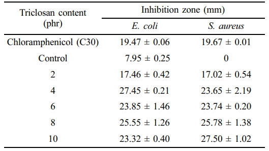 Triclosan is one among several choices. Triclosan is a single-hydroxyl group trichlorinated diphenyl ether antifungicides.14-16 Comparing the overall aspects, triclosan offers a unique balance of advantages: it is chemically stable, broadly effective against bacteria, easily dispersed within the NR matrix, cost-efficient compared to metallic agents, and retains its activity under processing conditions without compromising rubber properties. These attributes make triclosan a particularly attractive antibacterial agent for NR requiring durable and reliable protection. Triclosan is a widely used antimicrobial agent. Prapruddivongs and Sombatsompop17 found that the use of Triclosan in polylactic acid (PLA) resulted in an antimicrobial activity against E. coli, with inhibition rates of up to 83.4%. Zhang et al.18 modified the surface of polyvinyl chloride (PVC) with plasma treatment before coating it with Triclosan. This method also enhanced the antibacterial effectiveness of the PVC. Similarly, Asadinezhad et al.19 used Triclosan in PVC and chemically modified the polymer surface. The resulting product showed significant antibacterial efficacy.