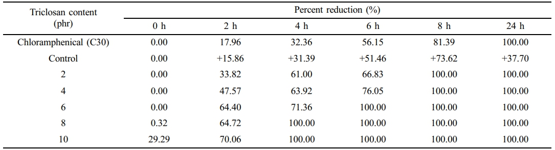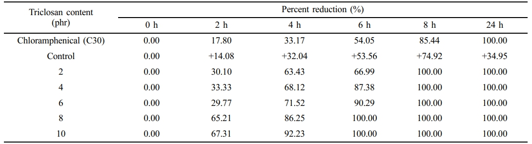 Table 4 Percent Reduction of E. coli Against Chloramphenicol and the NR Latex Foam Samples Prepared at Various Triclosan Content |