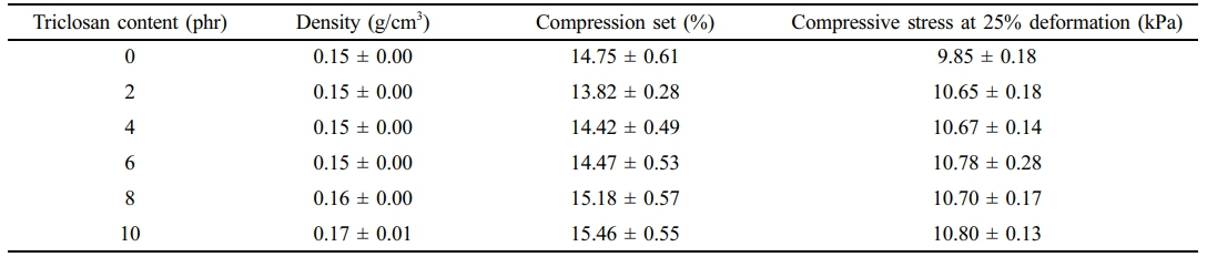 Physical Properties. Table 6 shows the effect of triclosan content on the foam density, compression set, and compressive stress at 25% deformation. It was found that increasing the triclosan content slightly increased the foam density. This is because the addition of solid material into the NR latex foam increases the weight of the resulting foam, while the volume of the foam remains the same. The density of NR latex foam with triclosan content ranging from 2–10 phr was between 0.15–0.17 g/cm³.