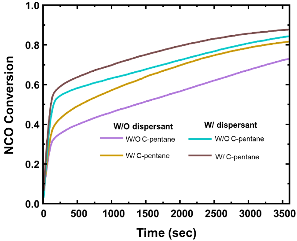accessory was used to analyze the reaction rates of PU composite foams including cyclopentane and dispersants by comparing the NCO conversion rates. FTIR data were collected in four scans at a resolution of 4 cm-1 and functional group changes were tracked using time-based software. A sample of the reaction mixture was placed on a diamond crystal and scanned at 8-second intervals for 60 min using an ATR accessory. After baseline correction, the NCO conversion was calculated using Eq. (1).