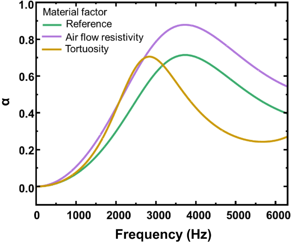 Figure 2 Model calculation for sound absorption coefficient considering air flow resistivity and tortuosity. It shows the changing graph shape when the airflow resistivity and tortuosity are increased by 60 %. For reference, r = 1.2×104 , s = 1.6, ø = 0.8; 60% increment of airflow resistivity, r = 1.92×104 ; 60% increment of tortuosity, s = 2.56.23 |
