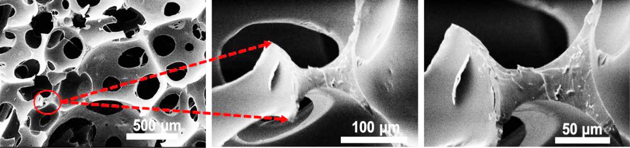 Morphology: A scanning electron microscope (SEM, SNE-3000 M, SEC Co. Ltd., at 15 kV, Korea) was used to investigate the microstructure of the foams. A sputter (MCM100, SEC Co. Ltd., Korea) was used to coat a gold film on the sample, and 15 images per sample were obtained and analyzed. The obtained images were analyzed using the Image-Pro Plus software. In each image, we analyzed the number of cavities, open pores, partially open pores, and closed pores and analyzed their average diameters and standard deviations.