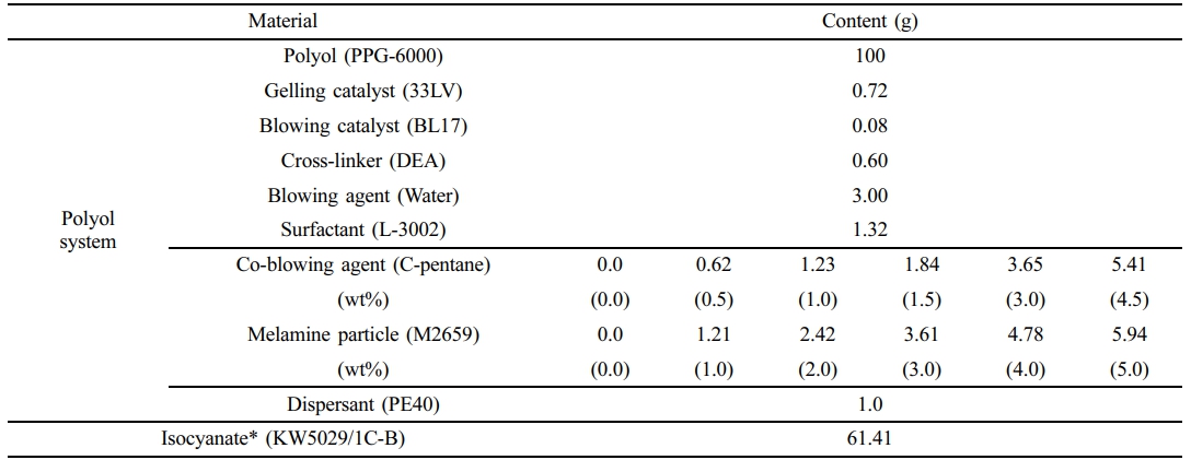 used as a surfactant, and cyclopentane (95%, Mw: 70.13 g/mol, SAMCHUN, Korea) was used as a physical co-blowing agent. Melamine particles (M2659, 430±15 μm, Sigma-Aldrich, USA) were used as a filler in the PU composite foam. Evonik PE-40 (Germany) was used as a dispersant to achieve a uniform distribution of melamine particles in the polyol mixture during the premixing step.