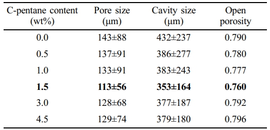 Table 2 Pore Size, Cavity Size, and Open Porosity According to Cyclopentane Content |