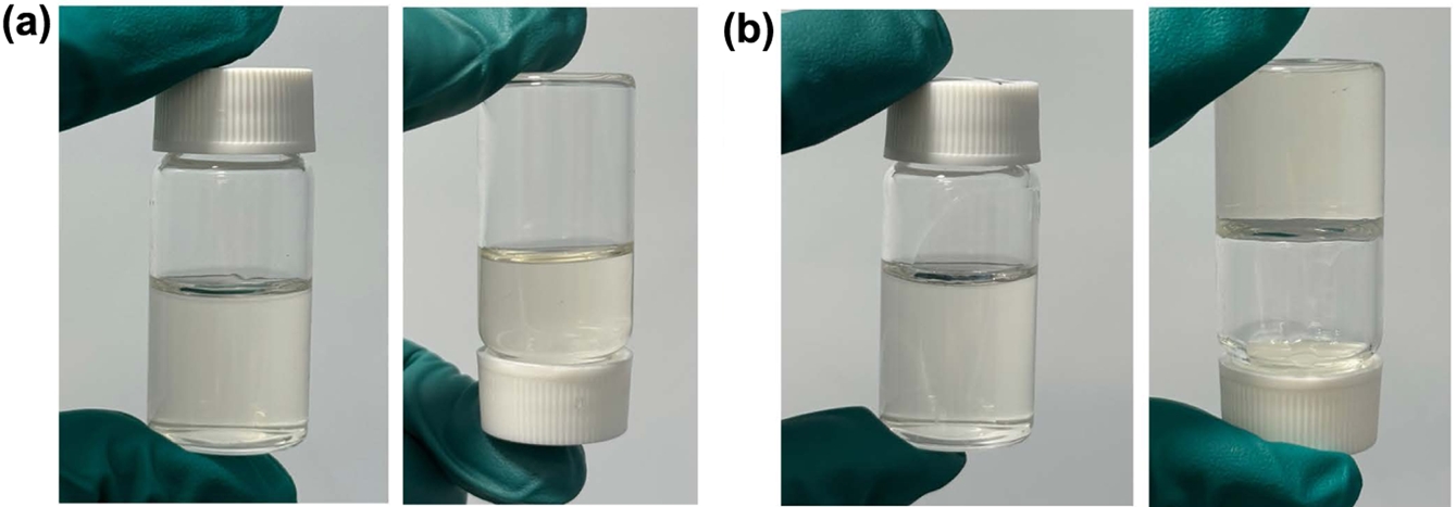 Figure 2 Images of PEGDA-based quasi-solid electrolyte solutions: (a) before; (b) after curing. |