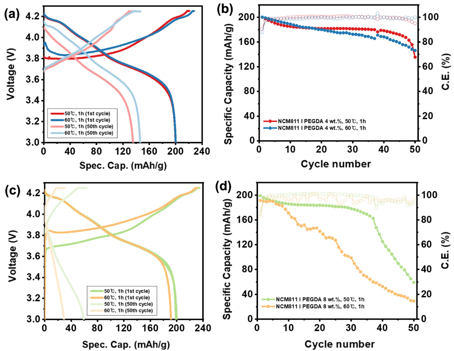 Figure 5 Voltage profiles of (a, c) formation (1st) and 50th cycle; and (b, d) cycle performances of NCM811 l PEGDA (a, b) 4 wt%; (c, d) 8 wt% l Li with various curing conditions. |