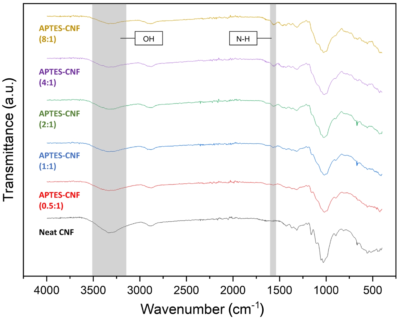 APTES-CNF 특성 분석. 구조 분석: APTES-CNF의 개질 여부 및 실란 농도에 따른 영향을 알아보기 위해 개질되지 않은 neat CNF와 APTES-CNF를 Fourier transform infrared spectroscopy(FTIR)을 이용해 측정하였다. 사용된 FTIR은 Bruker(미국) 사의 diamond ATR이 부착된 VERTEX 80 V FTIR을 이용하였으며, 파장은 400 cm-1에서 4000 cm-1 범위로 측정하였다.