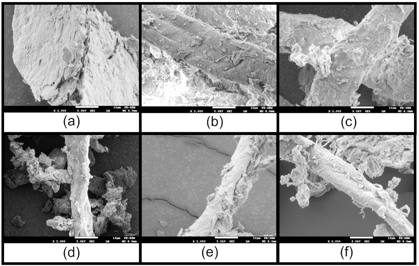 Figure 4 Morphology of APTES-CNF structure with different concentrations of silane: (a) neat CNF; (b) APTES-CNF(0.5:1); (c) APTES-CNF(1:1); (d) APTES-CNF(2:1); (e) APTES-CNF(4:1); (f) APTES-CNF(8:1). |