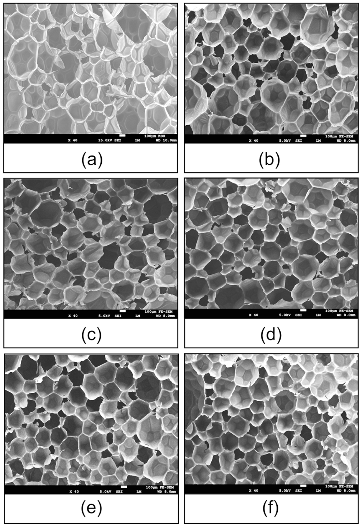 Figure 9 Cell morphology of APTES-CNF/PU composite foam with different concentrations of silane: (a) neat PUF; (b) APTES-CNF (0.5:1)/PUF; (c) APTES-CNF(1:1)/PUF; (d) APTES-CNF(2:1)/PUF; (e) APTES-CNF(4:1)/PUF; (f) APTES-CNF(8:1)/PUF. |