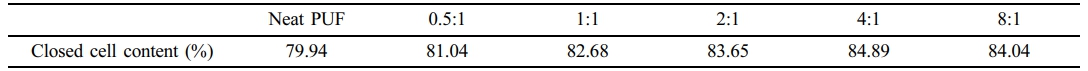 이는 PU 복합 발포체의 밀도가 유사한 상황에서 PU와의 상용성이 향상된 APTES-CNF가 핵제로서 작용하여 기공 크기가 감소하였으며, closed cell 함량이 증가했기 때문이다.
