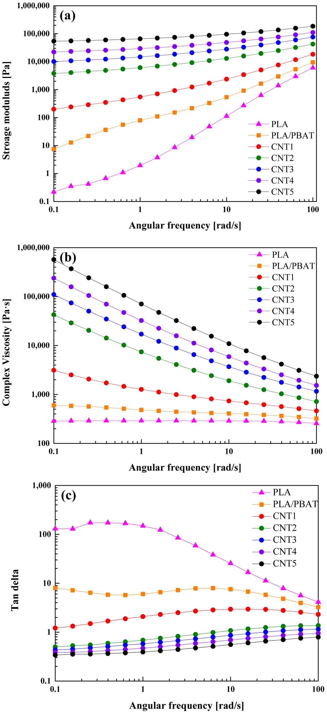 Figure 1 Dynamic Frequency Sweep Tests of biodegradable PLA/ PBAT blend with CNT: (a) storage modulus; (b) complex viscosity; (c) tan delta. |