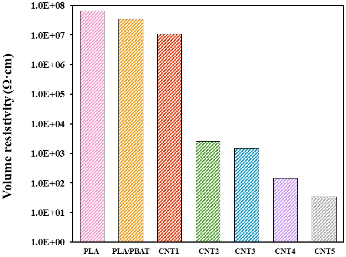 Figure 8 Volume resistivity of PLA/PBAT-based conductive composites through improved compatibility. |