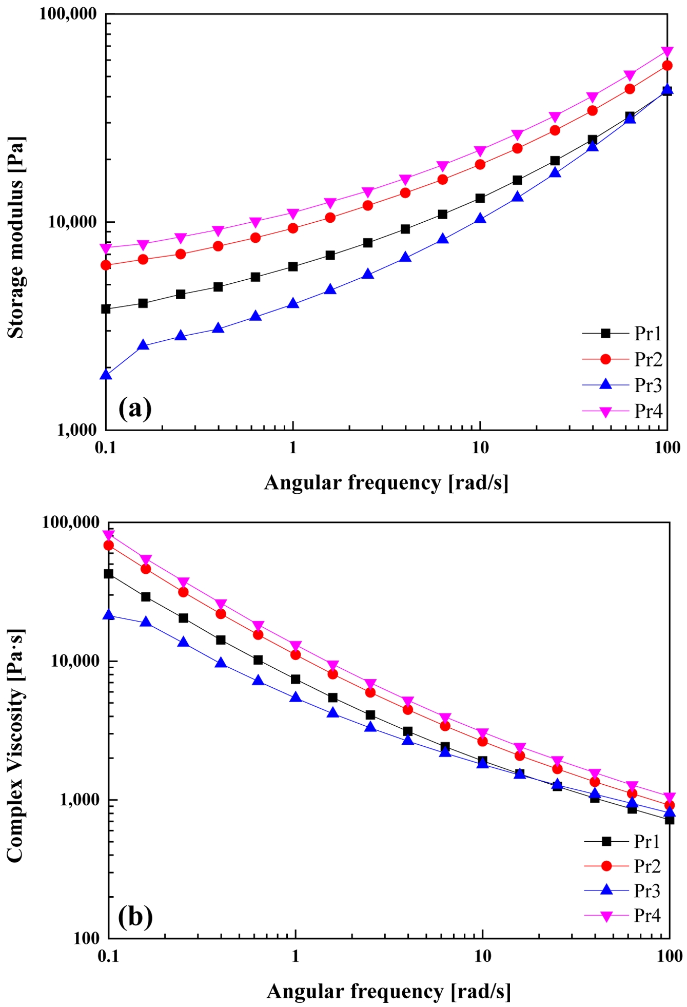Figure 5 Dynamic frequency sweep tests of the blend manufactured for mixing process optimization: (a) storage modulus; (b) complex viscosity. |