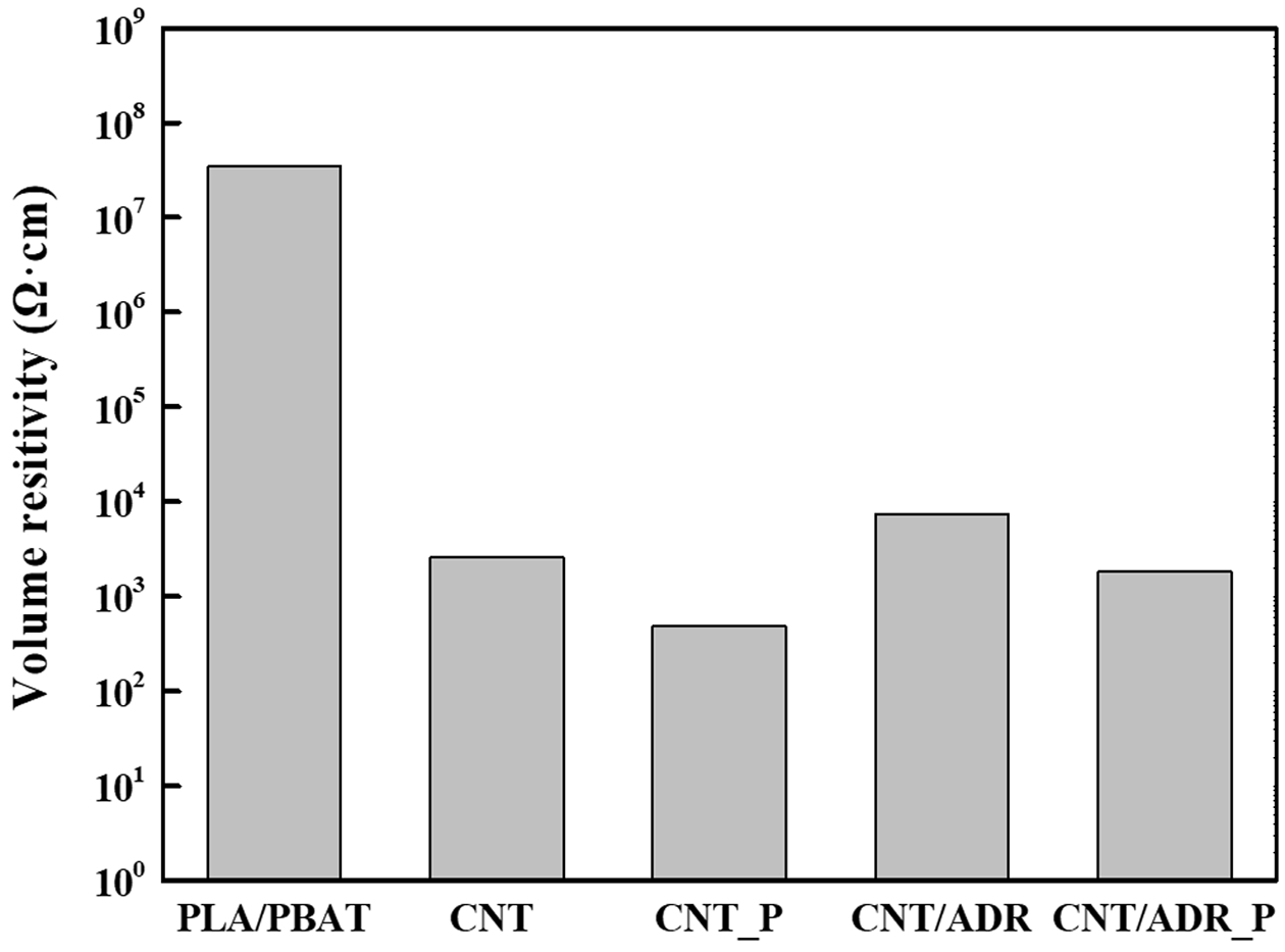 제조한 복합소재의 전기적 특성을 조사한 결과 PLA/PBAT를 제외한 블랜드는 모두 도체 영역의 체적저항률을 보이나, 동일한 함량의 CNT가 첨가되었음에도 불구하고 모두 다른 체적저항률을 보이게 된다(Figure 8). 이를 통해, 상용화제 첨가 또는 고분자 매트릭스 사전용융 혼합 여부가 CNT의 분산이나 고분자 블랜드의 구조적 변화를 초래하여 전도성 경로 형성에 영향을 주었다고 판단할 수 있다. 제조한 블랜드 중 체적저항률이 가장 낮은 샘플은 CNT_P이다. 이는 유변학적 물성 분석 결과와도 일치하는 결과이며, double percolation 이론에 의해 CNT가 두 고분자 계면에 주로 위치하고 공연속 구조를 형성한 CNT_P가 가장 높은 전기적 특성을 나타내게 되는 것이다. 이에 반해 ADR을 첨가하는 경우, 상용성 개선으로 분산 상의 크기가 작아지게 되면서 공연속 구조 형성에 방해가 되어 오히려 체적저항률이 약간 증가함을 볼 수 있다. 이를 통해, 전도성 네트워크을 형성하기 위해서는 비상용성 고분자 매트릭스의 상용성 개선보다도 CNT의 위치와 공연속 구조 형성이 더 중요한 요소임을 확인하였다.