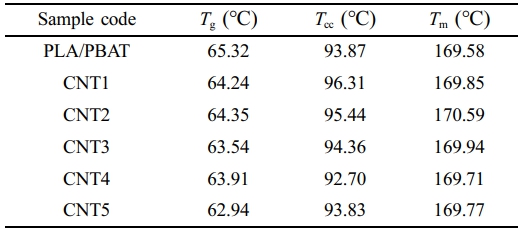 블랜드의 열적 특성을 확인하기 위해 시차주사열량계(DSC)를 사용하였다. Table 2는 PLA/PBAT 블랜드의 유리전이온도, 냉결정화 온도, 용융 온도는 PLA 수지의 특성을 나타내는 것을 알 수 있다. 제조된 블랜드에서 CNT의 함량이 증가함에 따라 유리전이온도, 냉결정화 온도는 감소한다. 비상용성의 고분자를 블랜드하는 경우, 유리전이온도는 주로 함량이 높은 고분자에 의해 결정된다. 그러나 두 고분자의 친화성이 증가하면, 블랜드의 유리전이온도는 두 고분자의 유리전이온도 사이 값을 나타낸다. 이러한 이유로, PLA/PBAT에 CNT 함량이 증가함에 따라 PLA 유리전이온도가 낮아지고 있어, 즉 두 고분자의 상용성이 증가하는 것이라 판단할 수 있다. 이는 SEM에서 살펴본 모폴로지 분석 결과와도 일치하는 결과이다. 추가적으로, CNT 함량이 증가함에 따라 냉결정화 피크가 약해지는 것을 볼 수 있다. 이는 결정화 엔탈피가 감소하는 것이며, 이를 통해서는 CNT의 존재가 결정화를 방해하고 있음을 알 수 있다. 또한, CNT 함량이 증가함에 따라 블랜드 내에 나노 입자의 양이 증가하게 되고, 이로 인해 결정 생성에도 더 많은 방해가 되어 결정화 능력이 약해짐을 의미한다.