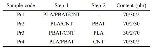 CNT 함량 최적화. 생분해성 PLA/PBAT 블랜드의 CNT 침투 임계 함량을 확인하고, 최적화하기 위한 실험을 수행하였다.수지 및 첨가제의 함량은 Table 1에 표기하였다.