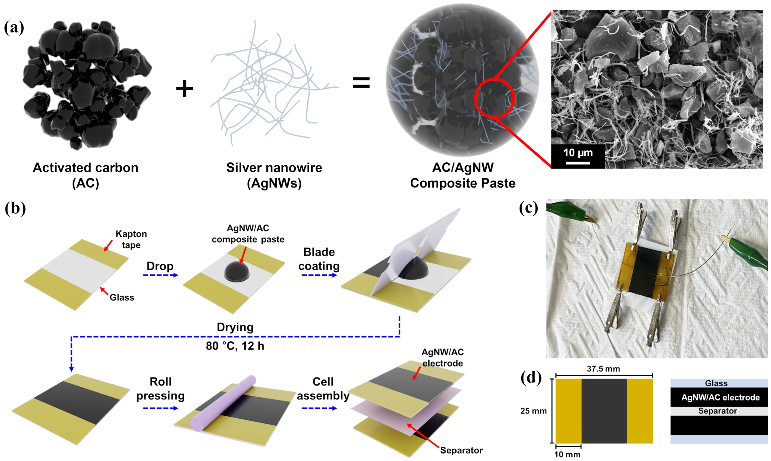 Figure 1 Fabrication and structure of the current collector-free AgNW/AC supercapacitor: (a) Schematic of the composite electrode materials and SEM image showing AgNW dispersion within the porous AC matrix; (b) Illustration of the electrode preparation and assembly process for the current collector-free configuration; (c) Photograph of the assembled symmetric supercapacitor; (d) Device dimensions (top view) and cross-sectional schematic illustrating the electrode–separator configuration. |