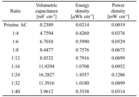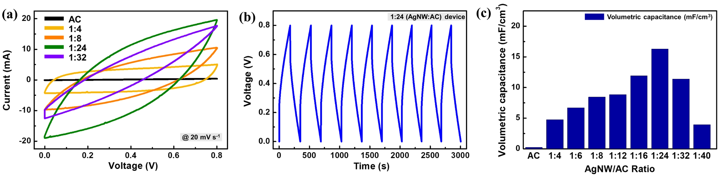 The reproducible curves indicate stable short-term operation with high coulombic efficiency, while extended cycling would be required to fully evaluate long-term durability. Figure 3(c) quantitatively summarizes the effect of the AgNW:AC ratio on electrochemical performance. The electrochemical parameters of all fabricated devices are listed in Table 1. The volumetric capacitance increases steadily as the AgNW content decreases from 1:4 to 1:24, reaching a maximum of 16.28 mF cm-3 at the 1:24 composition. At this ratio, the device also delivers an energy density of 1.46 μWh cm-3 and a power density of 0.13 mW cm-3, representing the best performance among all tested electrodes. In comparison, the AC-only electrode shows a negligible capacitance of only 0.24 mF cm-3, underscoring the essential role of AgNWs in establishing a conductive percolation network.