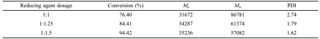 The effect of the reducing agent dosage on ln([M]0/[M]) is shown in Figure 5 (scatter plot, corresponding to the Y-axis on the left). As shown in this figure, a good linear relationship exists for all the conditions. The concentration of the active centers was nearly constant throughout the copolymerization, which indicates that the polymerization process obeys first-order kinetics. The corresponding copolymerization reaction rate constants increased according to the following order of catalyst-to-reductant ratios: 1:1, 1:1.25, and 1:1.5. Notably, the rate of the polymerization reaction considerably increased when the amount of reducing agent per unit dosage increased. This phenomenon may be attributed to the increase in the concentration of AA enhancing its reducing activity toward Cu2+, which accelerates the production of low-valent copper ions, Cu(I), in the copolymerization system and thus increases the polymerization rate.