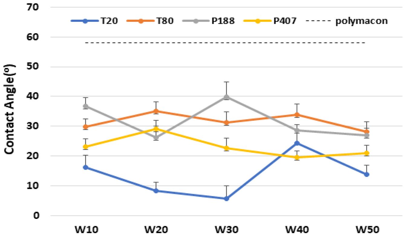 P188을 사용한 렌즈는 물 함량이 20%일 때 26.3o으로 접촉각이 가장 낮았으며, P407의 경우 물 함량이 20%일 때에 가장 높았으며, 40%일 때 19.5o로 가장 낮았다. P407 계면활성제를 사용하면, polymacon에 비해 접촉각이 약 3배 감소되어 습윤성이 우수한 것으로 나타났다.