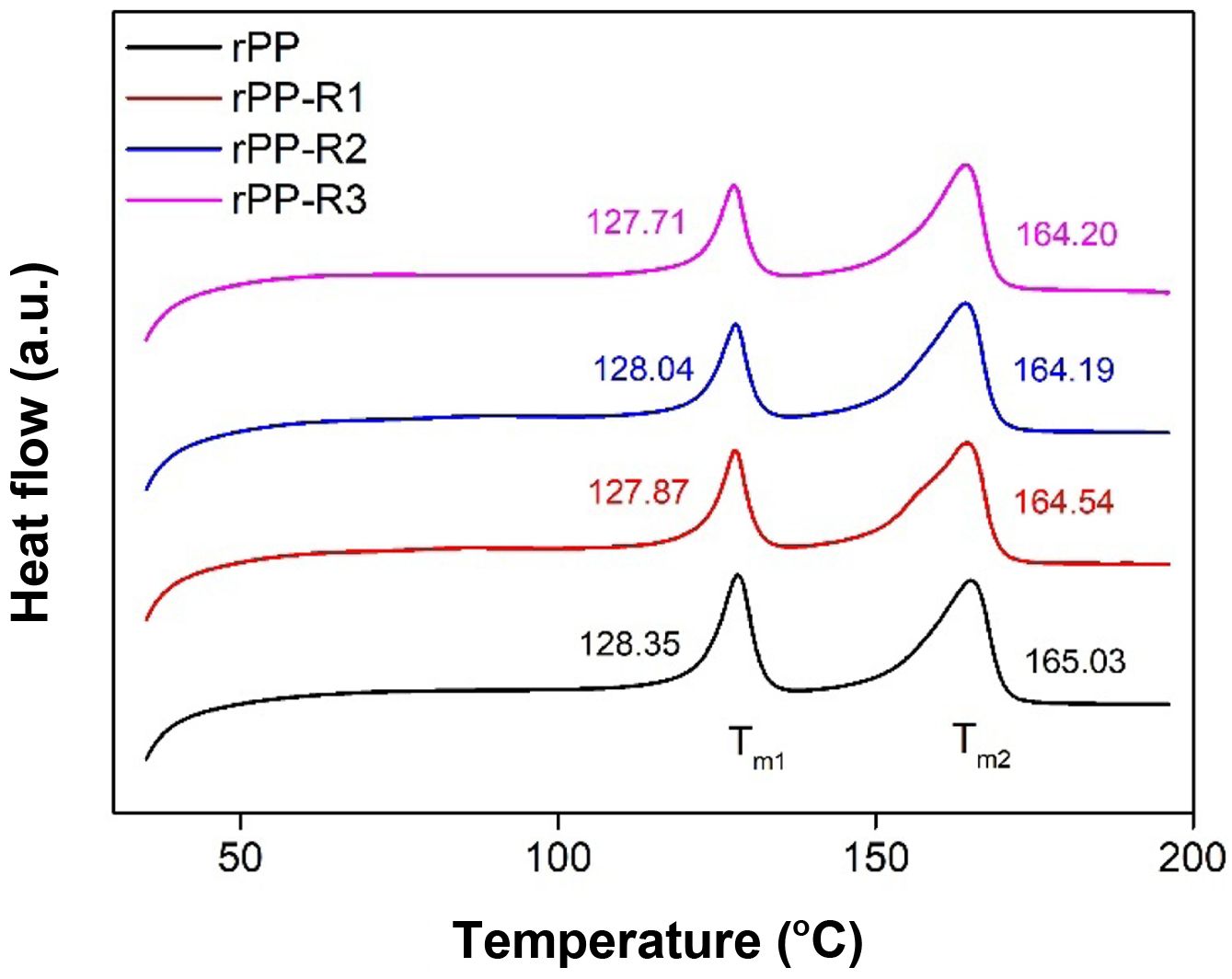 시차주사열량계(differential scanning calorimetry, DSC) 분석 결과(Figure 1), 재활용 PP 외에 PE의 피크가 동시에 확인되었다. 130 ℃ 부근에서 PE 피크, 165 ℃ 부근에서 PP 피크가 확인된다. 선별 공정의 한계로 완벽하게 PP와 PE가 분리되지 않았음을 보여준다.