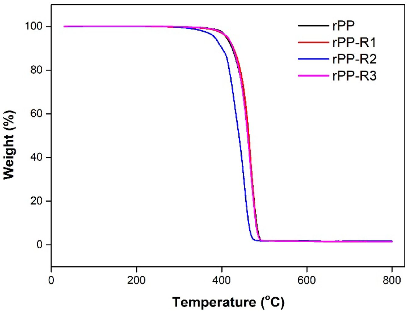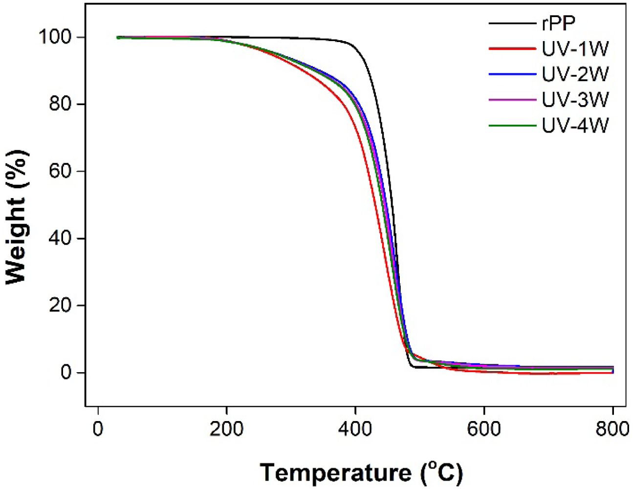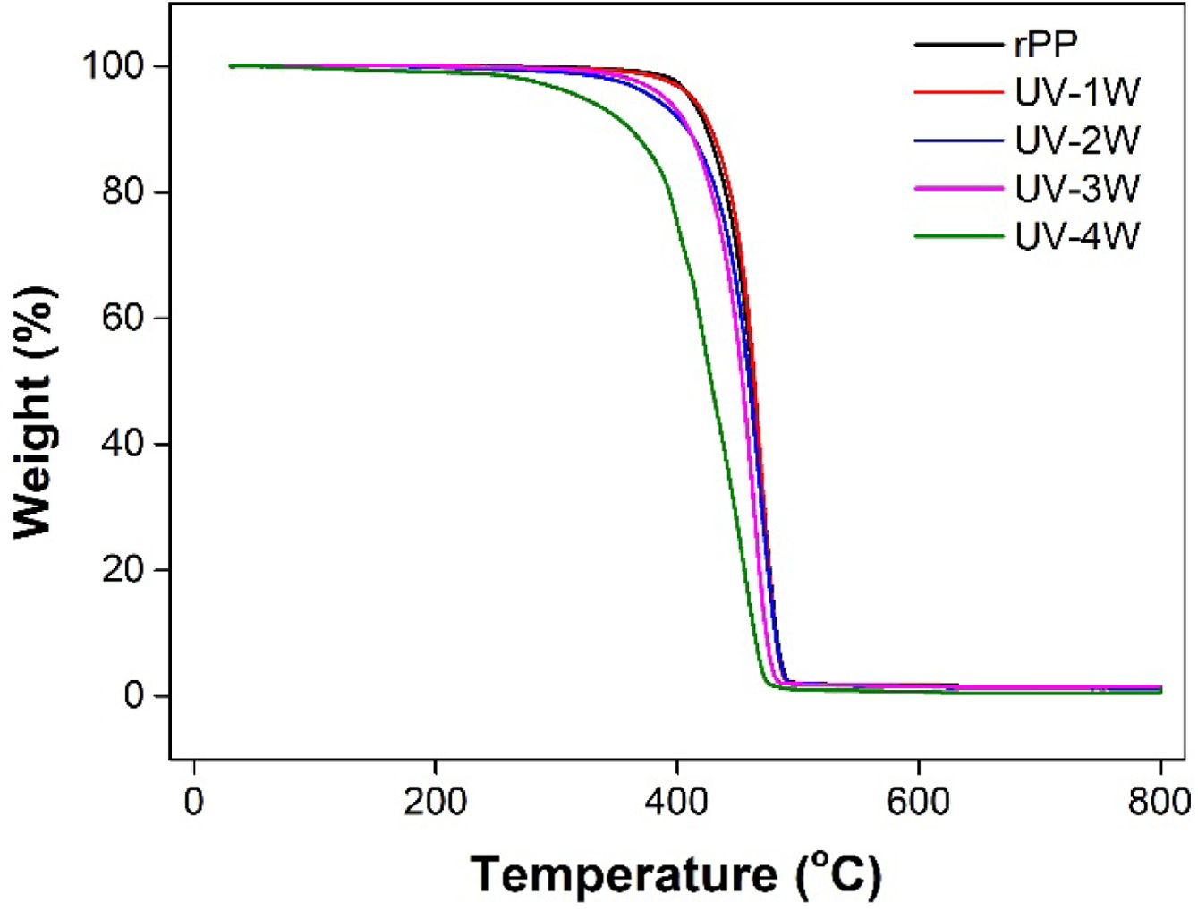 Figure 11에서 TGA 분석 결과, 분해 시작 온도(onset, Td)가 일반 재활용 PP보다 20-30 ℃ 낮게 나타났으며, 이는 UV 조사로 생성된 저분자량 산화물이 조기 분해됨을 의미한다.14