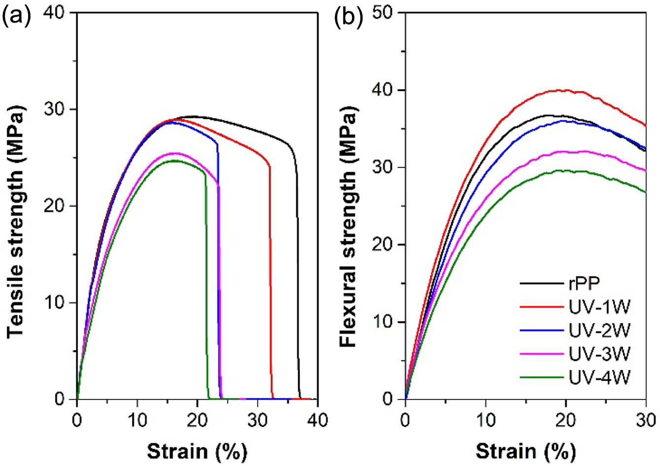 Figure 6 S-S curves of recycled PP with different UV aging duration after: (a) tensile test; (b) flexural test, respectively. |