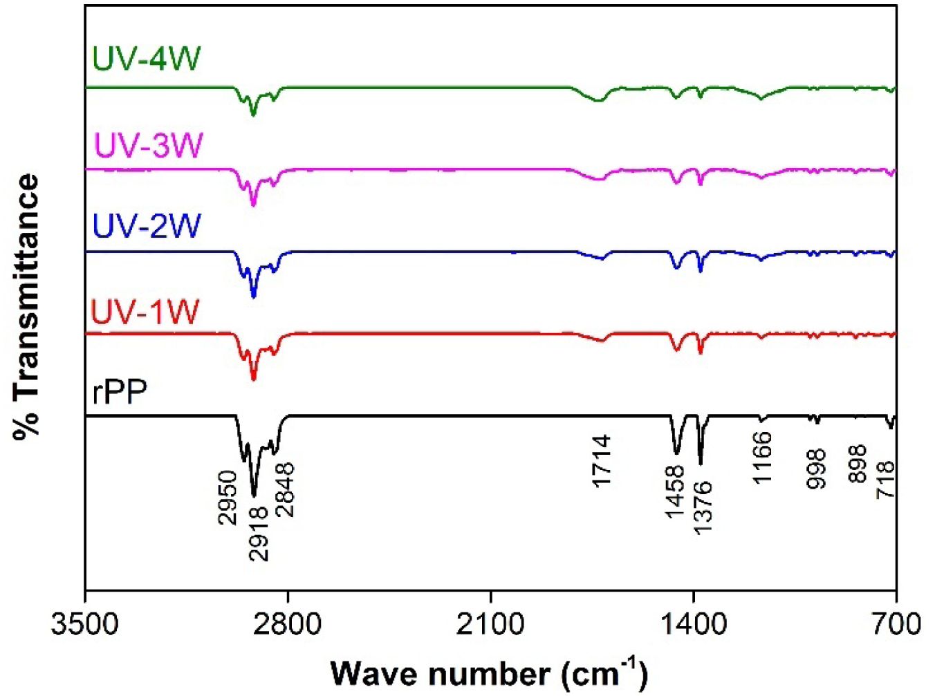 Figure 7 FTIR results of recycled PP with different UV aging duration. |