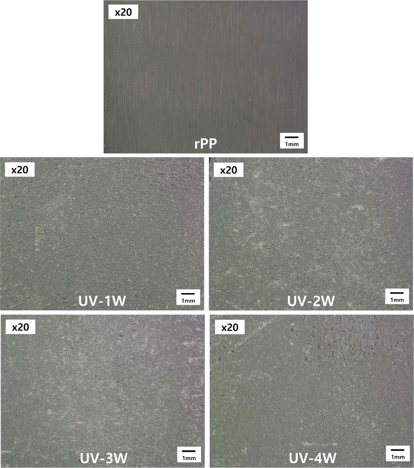 Figure 8 Optical microscope images of the surface of specimen on recycled PP with different UV aging duration. |