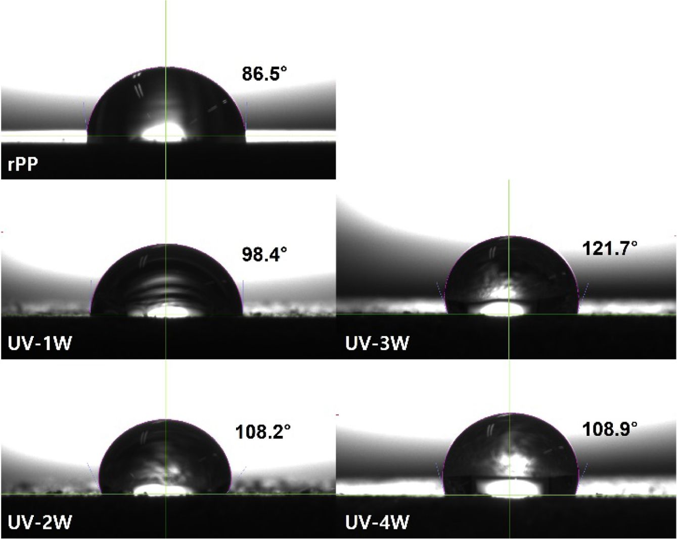 Figure 9 Pictures of the contact angles of water on recycled PP with different UV aging duration. |