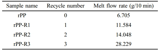 다회차 재활용 PP의 물성 변화. 열적 특성 변화: 재활용 공정 횟수가 증가함에 따라 소재의 분자량 변화 분석을 위하여 MFR를 분석하였다(Table 1). MFR 분석 결과에서 재활용 횟수가 증가함에 따라 재활용 PP 소재의 용융 흐름지수 증가 폭이 재활용 원자재와 비교하여 3회차 재활용 자재는 약 421%가량 증가하였다. 이와 같은 MFR 증가는 재활용 중 사슬 절단으로 인한 분자량 감소에서 유래된다.1