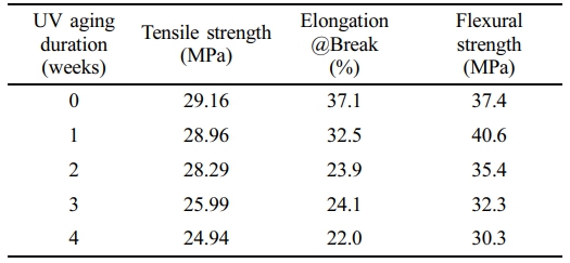 기계적 특성 변화: UV 노화 기간이 길어질수록 인장강도와 신율이 선형적으로 감소하였다(Figure 6(a), Table 3).7UV에너지가 C–C 및 C–H 결합을 끊고, 산소와 반응하여 산화 분해를 일으키는 광열화 메커니즘이 작용되었을 것으로 판단된다. 굴곡 강도는 UV 노화 1주차에 증가했다가 감소하였다 (Figure 6(b), Table 3). 이는 UV에너지로 인해 표면에 일부 가교가 일어나 발생하는 현상으로 판단된다.8