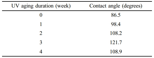 또한, UV 조사에 따른 표면의 분해와 백화현상으로 시편 표면의 백색분말이 떨어져 나오고 표면이 갈라지는 현상이 확인되었다(Figure 8). 이 분말들은 표면에 흡착되거나 일부 탈락하여 불균일한 표면을 형성시킨다. UV 조사에 따른 표면 변화를 확인하고자 접촉각을 측정하였다(Table 4, Figure 9). UV 노화 1주차~3주차는 소수성이 증가하였는데 이는 분말이나 미세한 요철이 물방울과 공기층을 형성했기 때문이며, 4주차가 되어 표면의 분말이 떨어져 나가 표면 거칠기는 증가하나 크랙이 깊어져 접촉각이 감소하는 경향성을 보였다.11