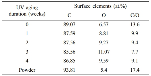 구조 변화 분석: UV 노화에 따른 표면 분말 및 소재 표면 구조 변화 분석을 위해 X선 광전자 분광기(X-ray photo electron spectroscopy, XPS)분석 결과, UV 노화 주차가 증가할수록 탄소 원자 비율이 감소하고 산소 원자 비율이 증가하는 경향을 확인했다(Table 5). 이는 UV조사에 의해 PP 분자내 C-H 결합이 분해되고 라디칼이 형성된 후 공기 중 산소와 결합하여 C-O, C=O 결합을 형성했기 때문으로 판단된다.