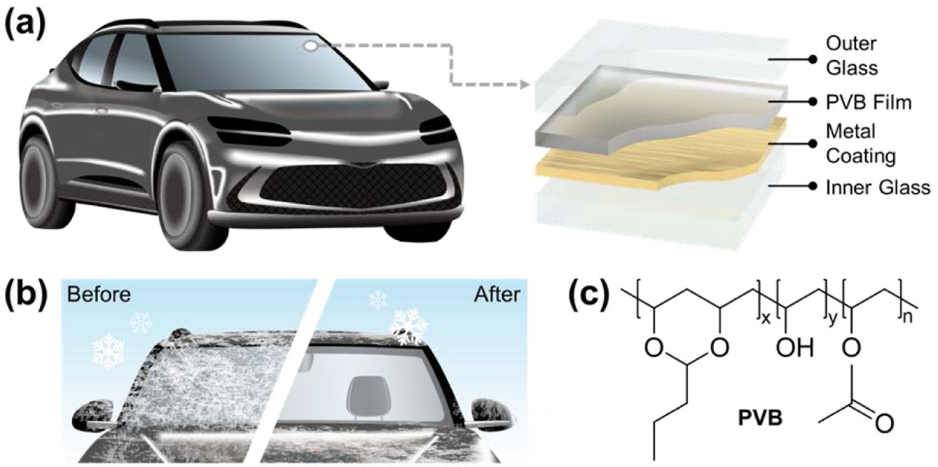 Figure 1 (a) The heated windshield for electric vehicles (left) and a schematic structure of the laminated heated glass consisting of a metal-coating layer and a poly(vinylbutyral) film (right); (b) The de-frost on the windshield after an electrical power is applied to the heated glass; (c) The molecular structure of Poly(vinylbutyral). |