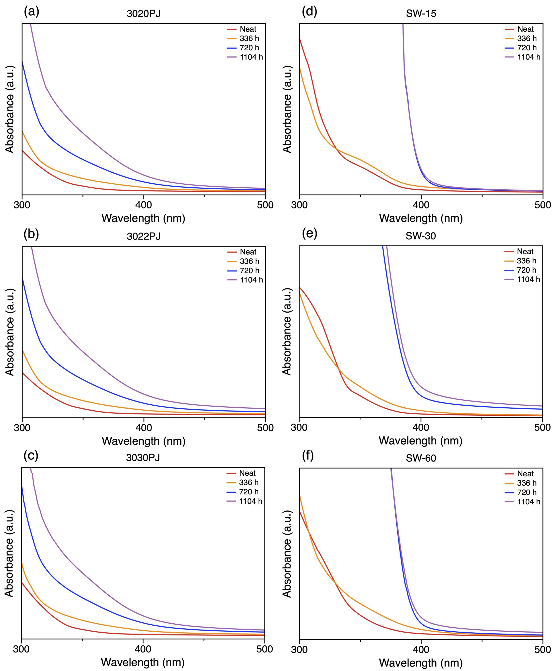 Figure 2 UV-Vis absorbance spectra of PC samples over time: (a) 3020PJ; (b) 3022PJ; (c) 3030PJ; (d) SW-15; (e) SW-30; (f) SW-60 |