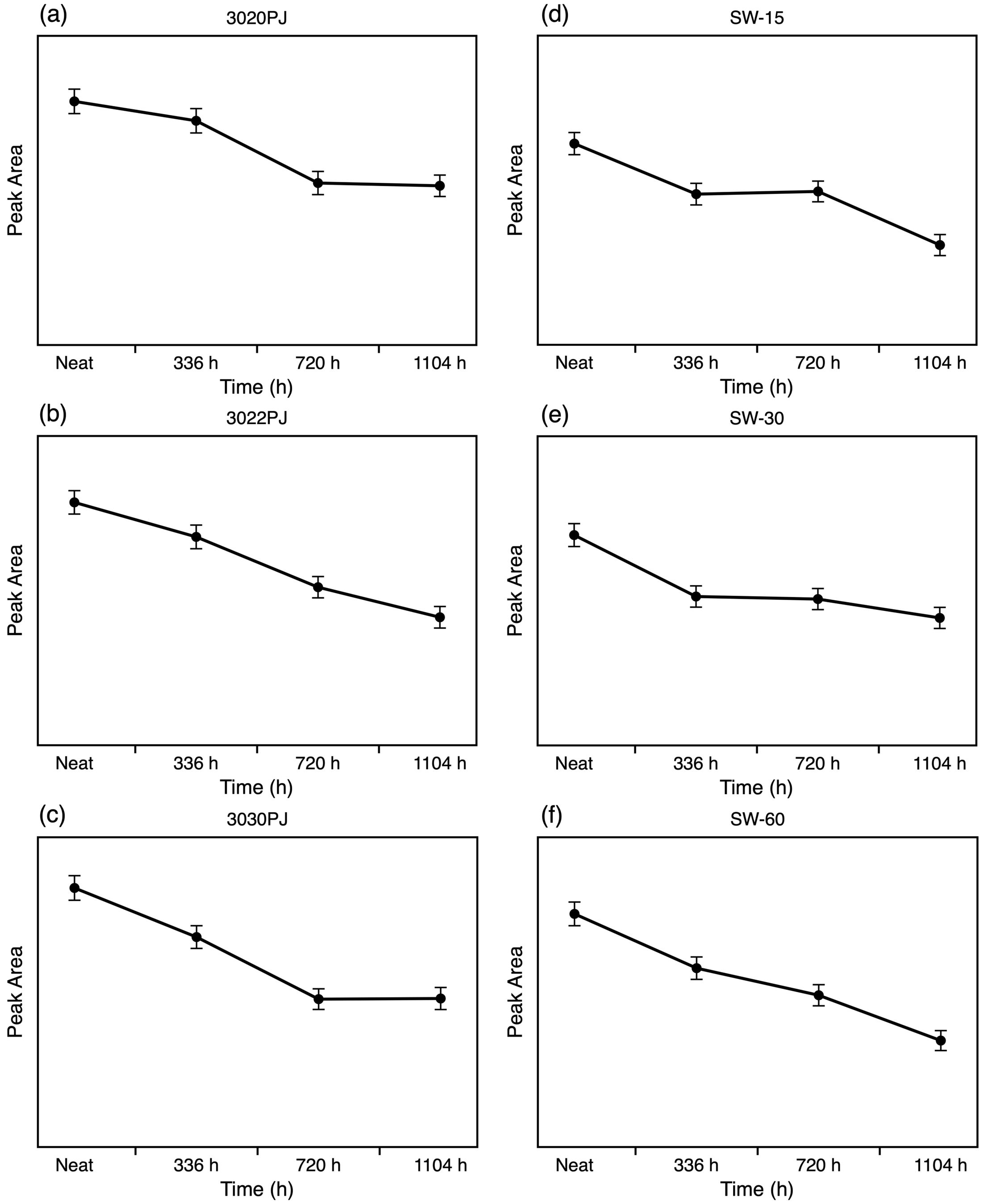 Figure 4 Peak area of the first diffraction peak in PC samples obtained from XRD analysis: (a) 3020PJ; (b) 3022PJ; (c) 3030PJ; (d) SW-15; (e) SW-30; (f) SW-60. |