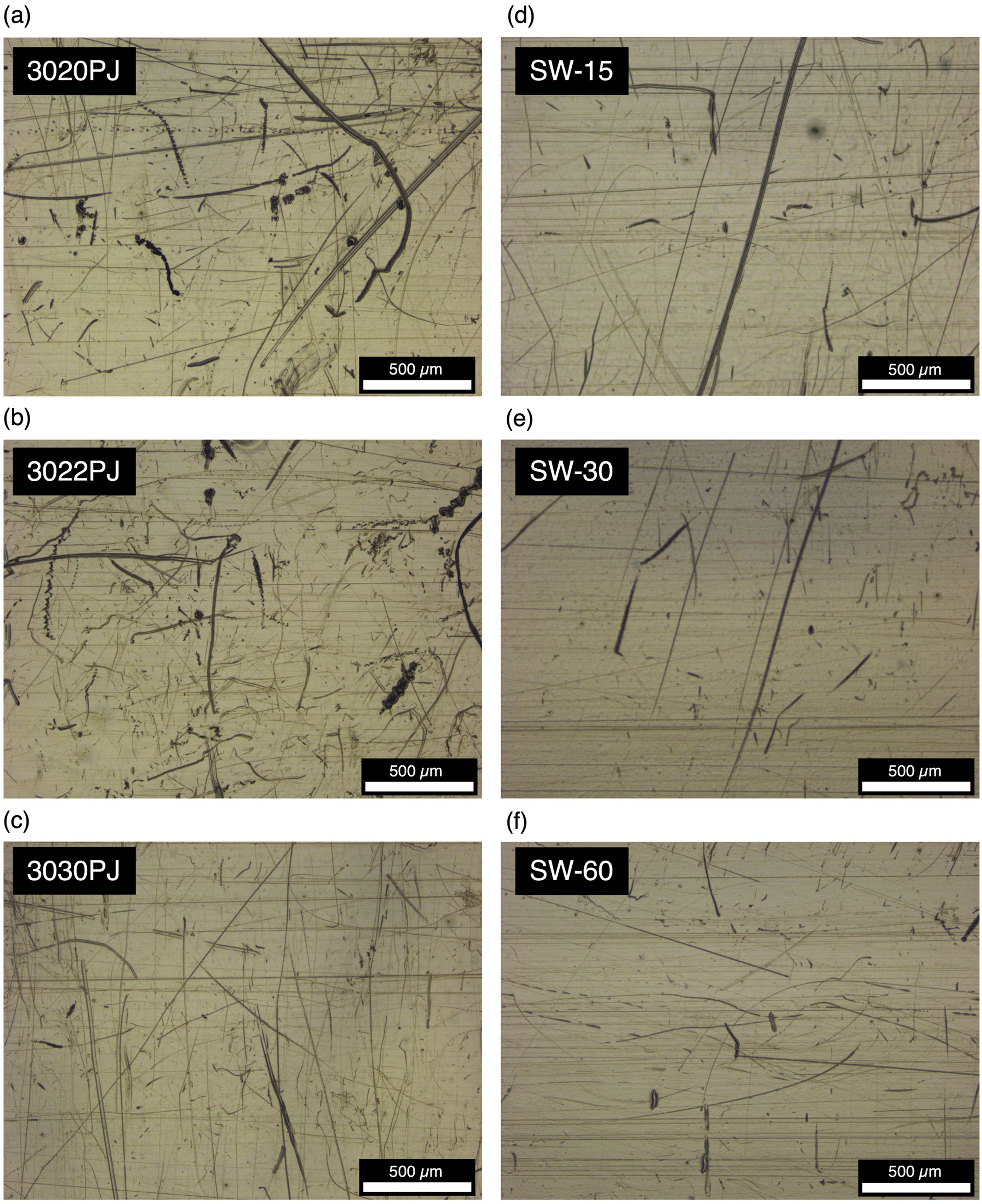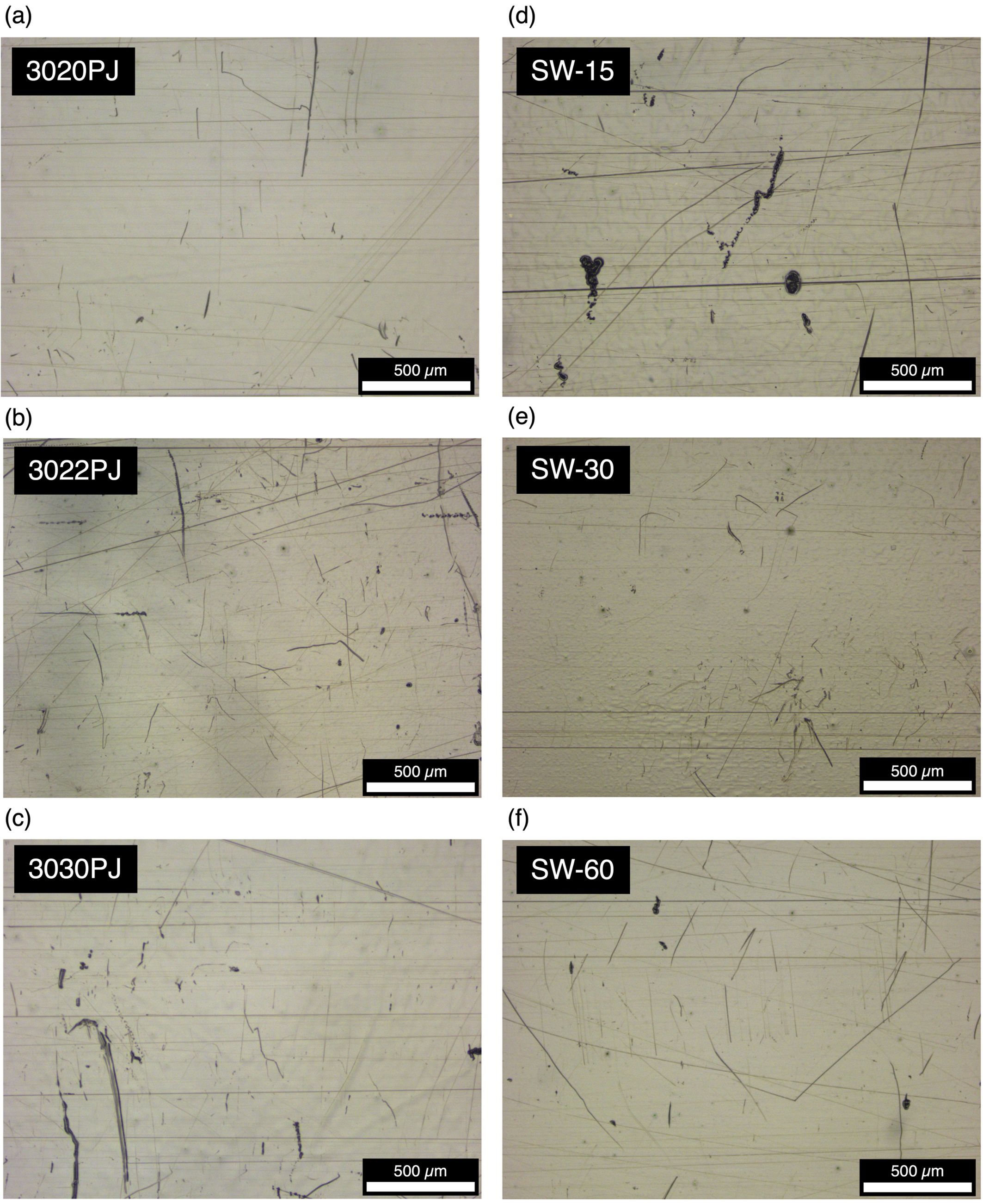 Figure 7 OM images of PC samples at 0 h: (a) 3020PJ; (b) 3022PJ; (c) 3030PJ; (d) SW-15; (e) SW-30; (f) SW-60. |