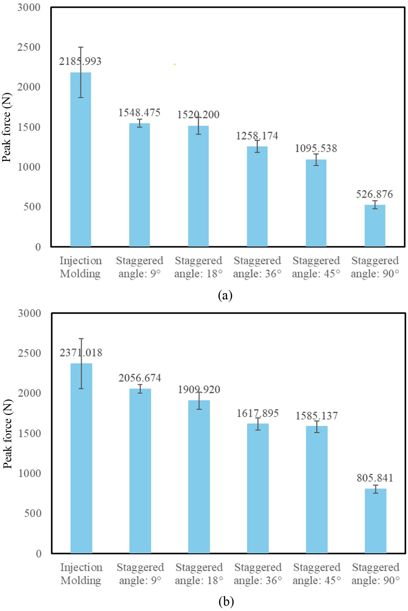 Figure 7 Peak force of specimen according to staggered angle: (a) thickness 2.5 mm; (b) thickness 3.2 mm |
