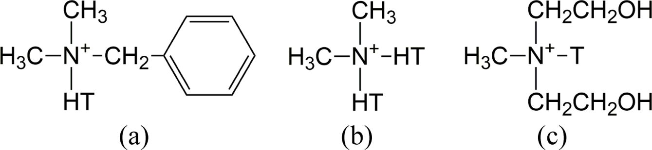 Figure 2 Chemical structures of nanoclays used in this study: (a) Cloisite 10A; (b) Cloisite 20A; (c) Cloisite 30B. |