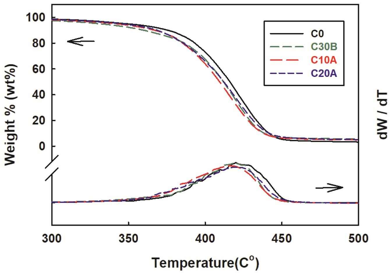 첨가한 나노클레이 종류에 따른 결과를 Table 2에 정리하였다. 박리가 아주 잘된 경우에는 분해온도가 증가하는 것이 보통인데 이 경우 나노클레이가 2 phr 첨가되었을 때 5 wt%-분해온도는 10~20 ℃ 낮아졌고 최대분해온도도 4~8 ℃ 낮아졌다. 이는 다른 나노복합체에서도 나타나는 현상으로 많은 경우 나노클레이 표면의 촉매작용으로