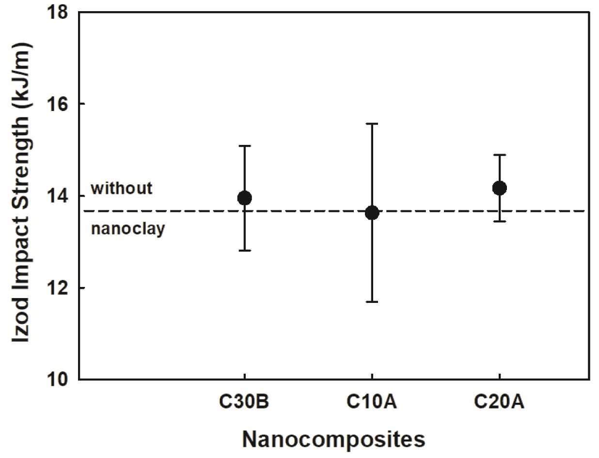 나노복합체의 충격강도를 Figure 15에 나타내었다. 나노클레이를 첨가하지 않았을 때 충격강도는 약 13.6 kJ/m인 반면에 나노복합체는 13.6~14.2 kJ/m로 약 ~4.4% 향상되었다. 순서는 C20A > C30B > C10A @ C0 순이었다. 충격강도 결과도 Table 4에 추가하여 정리하였다.