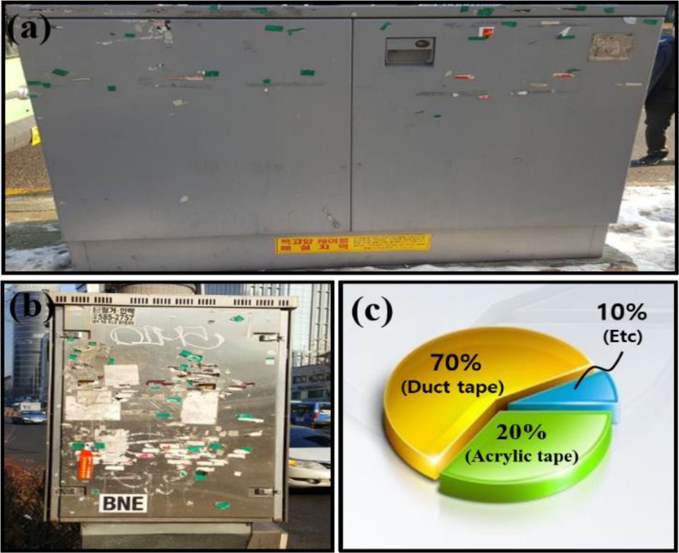 이에 따라 보행자의 통행 불편에 대한 민원이 보고되고 있으며, 특히 상업 광고용 포스터, 전단지 및 스티커를 지상 개폐기와 변압기에 무단으로 부착하여 미관을 저해하고 있어, 이에 대한 원상 복구 민원이 다수를 차지하고 있다. 증가하고 있는 민원 해소를 위해 Figure 1과 같이, 지상 개폐기와 변압기에 부착된 상업 광고물, 전단지 및 스티커를 주기적으로 제거하고 있으나, 불법 광고물들의 부착은 지속적으로 증가하고 있고, 상당한 제거 시간, 인력 및 비용이 주기적으로 소모되고 있기 때문에 인적, 경제적 손실이 큰 실정이다. 국내 일부지역(서울, 경기, 인천 및 대전)을 대상으로 무단 광고물 부착 유형을 확인한 결과, 폴리이소프렌(polyisoprene)기반 감압 접착제를 사용한 면테이프(duct tape) 부착물은 약 70%, 투명테이프(clear tape) 부착물은 약 20%를 차지하며, 나머지 10% 광고물은 끈이나 매듭을 이용한 방식으로 확인되었다.