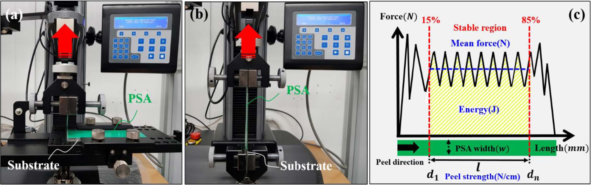 90° 박리시험. Figure 2(a)는 감압 접착제류의 90° 박리시험 방법에 대한 사진이다. 감압 접착제류의 박리길이와 시편 거치대가 이동하는 길이를 일치시킬 수 있는 슬라이딩 기능을 추가하였으며, 이를 이용하여 시험 중에 안정적으로 90° 박리를 계속 유지할 수 있도록 설계하였다. 감압 접착제류가 박리될 때 발생하는 힘을 로드셀로 측정하였으며, 로드셀에서 측정한 전체 박리구간(160 mm)에서, 불안정하게 측정되는 앞과 뒤 각각 15% 구간을 제외한 70% 안정범위에서 데이터 평가 및 분석을 실시하였다.