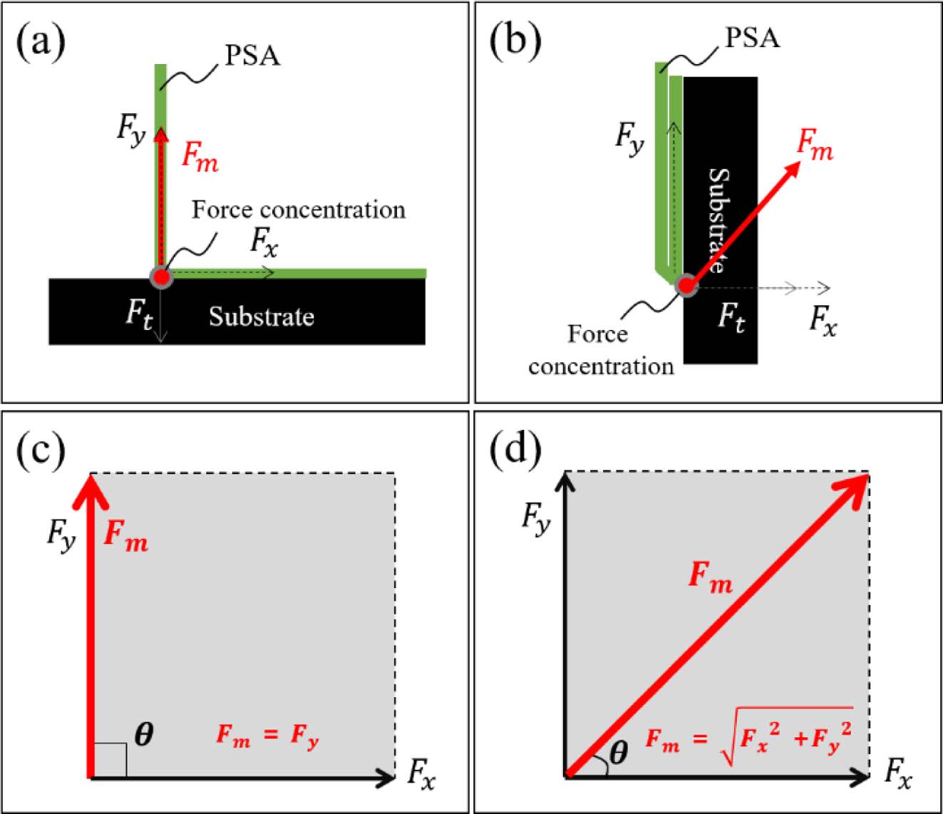 Figure 3(c)와 3(d)는 각 작용점에서 힘을 분해한 것으로, 감압 접착제의 박리가 시작되는 작용점에서 발생한 Fm을 해석 하고자 한다. Fm은 x-성분 Fx과, y-성분 Fy으로 분해되며, 이는 각각 Fx= Fmcosθ, Fy= Fmsinθ로 정의할 수 있다. 90° 박리시험에서는 Fx와 Fy간의 각도, θ는 90°이므로, Fx의 크기는 0이 되고, F90=