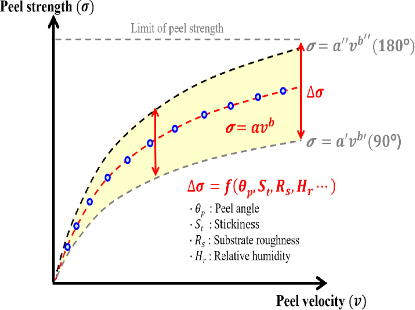 테이프 박리특성 모델링. 테이프를 대상 기판에 떼어낼 때에 박리특성과 관련된 주요 인자로써 박리속도(v), 감압 접착제와 기판의 각도(θp), 감압접착제의 점착력(St), 기판의 조도 (Rs)와 상대습도(Hr)를 고려할 수 있다. Figure 4에서 주요 인자와 박리특성 개념을 모델링하고 이에 대한 박리관계식 y = axb 및 연관성을 제시하였다.14,15 같은 제품 안에서 감압접착제 고유의 박리강도는 비교적 동일하지만, 대상 기판에서 감압 접착제를 박리할 때의 속도와 방향은 사람마다 차이가 있기 때문에 각 조건에서의 알짜힘은 크기와 방향에 따라 달라진다. 감압 접착제를 빠른 속도로 박리시키면, 작용하는 알짜힘은 상승하며, 동시에 박리강도는 증가하게 된다. 이러한 속도 변화에 따른 박리특성 모델링을 통해, 박리속도에 대한 데이터 값들을 회귀분석하고 모델링하여, 시험기의 성능한계를 벗어난 박리속도에 대한 특성까지 추정하여 실제 현장에서 발생하는 다양한 박리특성을 예측하고자 하였다.