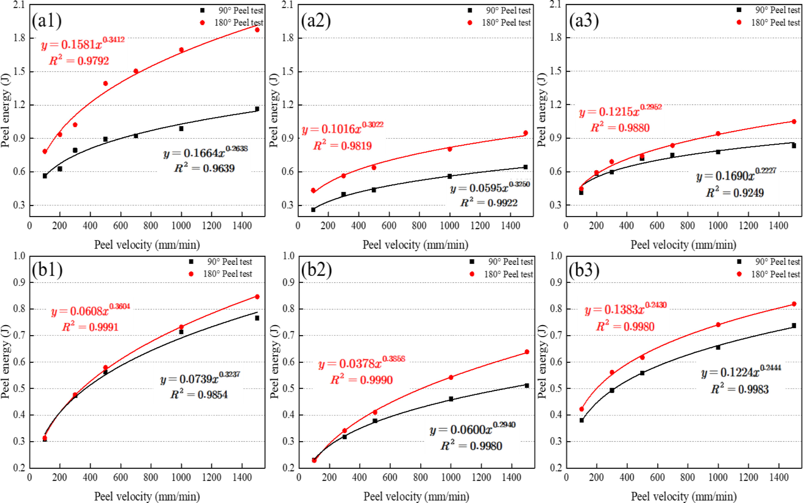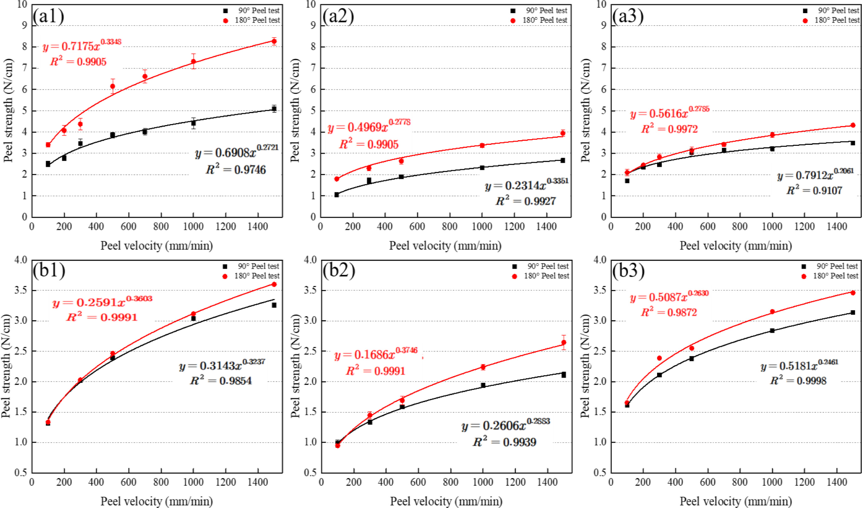 박리각도에 대한 고찰에서 설명한 바와 같이, 이 모델링 결과를 활용하여 박리강도가 최소가 되는 90°와 박리강도가 최대가 되는 180°의 관계식 y = axb을 바탕으로 90°~180° 사이에서 작용하는 박리강도를 예측할 수 있고, 폭넓은 속도 범위에 대한 박리강도를 또한 예측 가능하다. 예를 들어 분체도장 기판에 붙어있는 면테이프를 180° 박리에서 3000 mm/min으로 박리한다고 가정하면(Figure 5(a3)), y = 0.5616x0.2785 (R2= 0.9972)의 식을 활용하여 x값에 3000 mm/min를 대입하는 것으로, 해당 박리강도는 약 5.22 N/cm로 추정할 수 있다.
