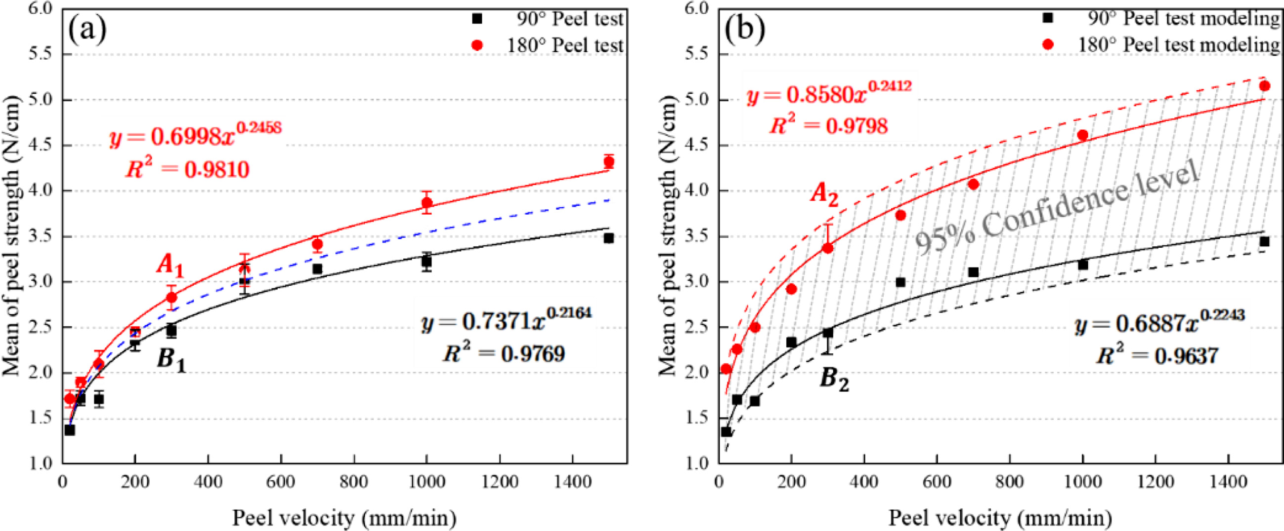 통계학적 박리특성 모델링. 신뢰성 높은 감압 접착제류의 박리특성 기준을 제시하고자, 다수의 동일 감압 접착제류로 반복 실험하여 모평균에 대한 95% 신뢰구간을 도출하고자 20개 이상의 감압 접착제류를 사용하였다. 각 감압 접착제당 10회의 반복 실험을 하여 박리속도와 각도에 대한 박리특성을 평가하였다. 300 mm/min의 속도 기준에서 90°와 180° 박리시험으로 평균 값(A2, B2 Figure 7(b))을 측정한 뒤에, 기존에 존재하는 300 mm/min의 속도에서의 값(A1, B1)과 비교하여 해당 변동 비율을 계산하였다. 90° 박리시험의 B2/B1는 0.988, 180° 박리시험의 A2/A1는 1.192로 측정되었다. 이 비율을 기준으로 나머지 값에 적용하여 해당 데이터에 대한 관계식을 도출하고, 모평균에 대한 95% 신뢰도 구간을 적용한 통계학적 박리특성 모델링을 Figure 7(b)와 같이 완성하였다. 분체도장 시편에 감압 접착제를 박리할 때의 박리특성은 90° 박리시험 그래프(y = 0.6887x0.2243, R2= 0.9637)와 180° 박리시험 그래프(y = 0.8580x0.2412, R2= 0.9798)로 모델링하였고, 이를 이용하여 90°~180° 사이의 모든 각도와 다양한 속도 범위에 따른 박리강도를 추정할 수 있기 때문에, 실제 현장에서도 폭넓게 활용 가능하다.
