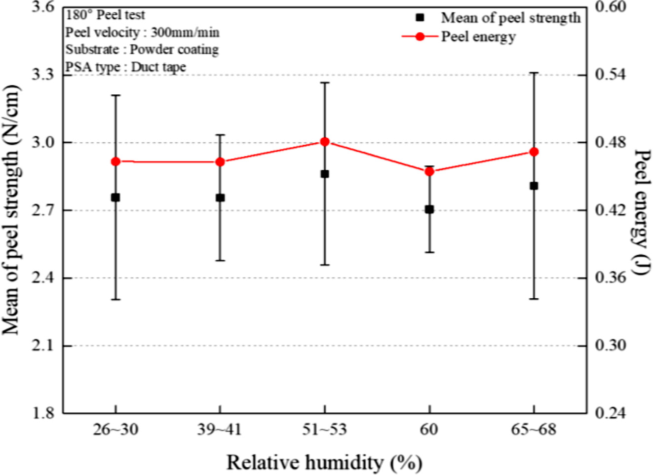 습도에 대한 박리특성 평가. 감압 접착제의 박리특성에 영향력있는 주요 인자 중에서 상대습도(relative humidity, %)에대한 영향을 평가를 하기 위해 항온 항습 부스를 설치하여 습도를 조절하였고, 기판과 감압 접착제를 일정시간 동안 충분히 습도에 노출시킨 후 박리시험을 실시하였다. Figure 8은 분체도장판에서 상대습도 변화에 따라 면테이프를 300 mm/min의 속도로 박리했을 때의 박리강도와 단위 박리에너지를 측정한 결과이다. 대상 기판에 감압 접착제를 부착한 다음 장시간(≥1년) 노출시키게 되면, 온도, 습도, 자외선 등 다양한 인자에 의해서 점착제의 고형화 및 열화가 발생하여 점착 및 박리특성이 저하되지만, 26~68% 수준의 상대습도가 변하는 환경에서 감압 접착제를 부착하게 되면, 박리강도와 박리에너지가 각각 약 ±5% 변동 폭은 있으나, 큰 차이를 야기시키지 않았다.